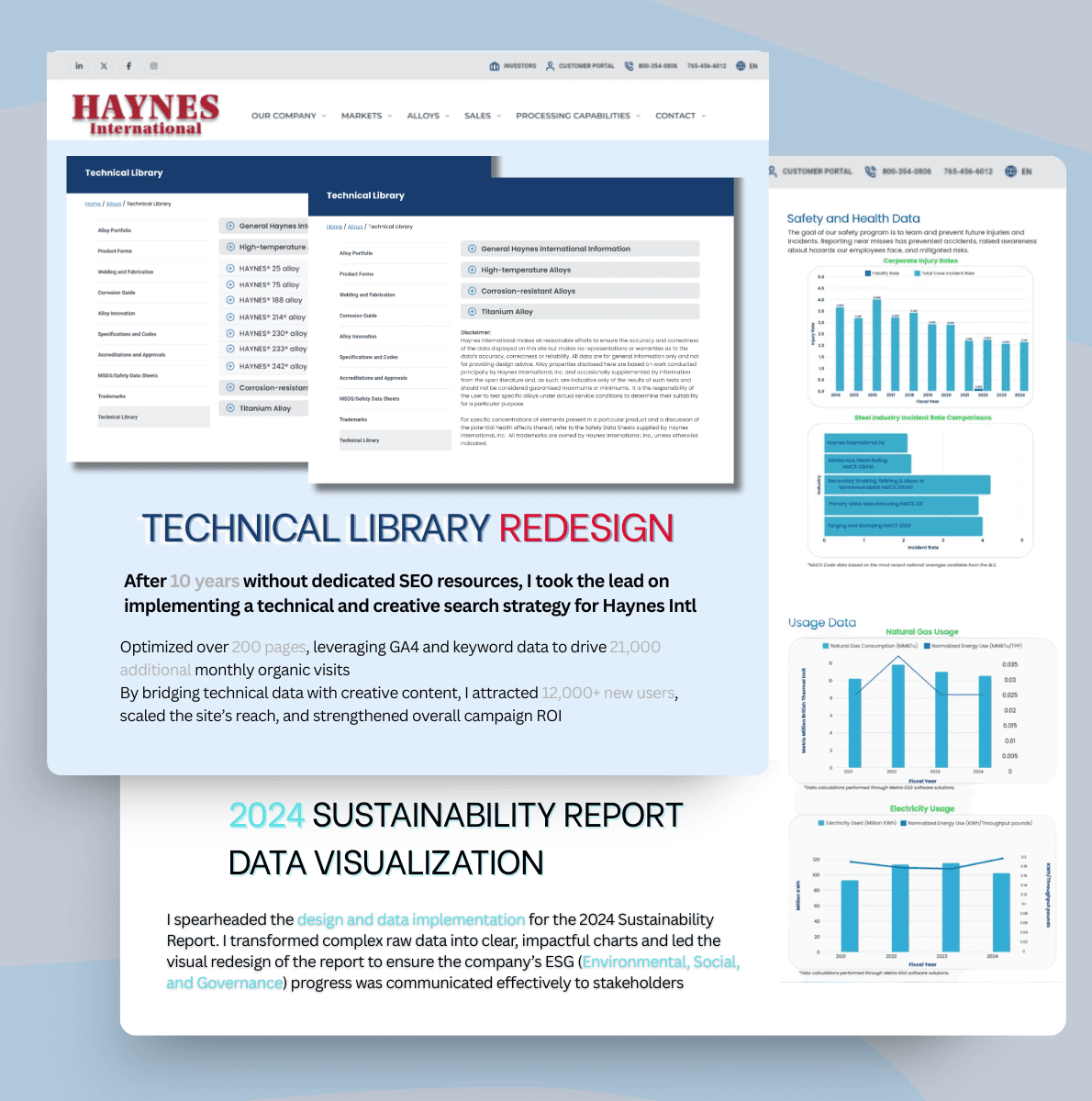 GROWTH & SEO: SCALED 200+ PAGES TO ACHIEVE +21K MONTHLY VISITS AND 12K NEW USERS INTERNAL COMMUNICATIONS: MANAGED THE CORPORATE INTRANET, EXECUTIVE NEWSLETTERS, AND EMAIL MARKETING CAMPAIGNS CREATIVE & REPORTING: LED PHOTOGRAPHY AND DATA VISUALIZATION FOR THE 2024 SUSTAINABILITY REPORT PERFORMANCE ANALYTICS: USED SOCIAL MEDIA AND GA4 DATA TO PIVOT CONTENT STRATEGIES IN REAL-TIME